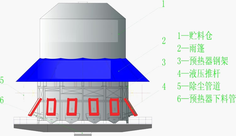 物料由豎式預(yù)熱器頂部料倉(cāng)經(jīng)下料溜管導(dǎo)入豎式預(yù)熱器本體預(yù)熱室內(nèi),同時(shí)在窯尾引風(fēng)機(jī)所產(chǎn)生的負(fù)壓的作用下將來(lái)自回轉(zhuǎn)窯窯尾煅燒所產(chǎn)生的高溫?zé)煔庖筋A(yù)熱器內(nèi)部,1000攝氏度左右的高溫?zé)煔庠诖┻^(guò)物料時(shí),與其發(fā)生熱交換,將物料預(yù)熱至800攝氏度以上,再由預(yù)熱器周邊布置的液壓推料裝置依次將預(yù)熱好的物料推出,穿越過(guò)料層的高溫?zé)煔獾臒崃看蟛糠直晃锪衔眨懦龅臒煔鉁囟燃s為240攝氏度左右,從而完成整個(gè)熱交換過(guò)程;每個(gè)液壓推料裝置均采用單獨(dú)的液壓缸驅(qū)動(dòng)耐熱鋼推頭進(jìn)行工作,通過(guò)PLC控制系統(tǒng)可以調(diào)節(jié)推頭之間的間隔時(shí)間及推頭自身的推料時(shí)間,準(zhǔn)確控制進(jìn)料量。最后經(jīng)下料溜槽和轉(zhuǎn)運(yùn)溜槽進(jìn)入回轉(zhuǎn)窯尾部進(jìn)行煅燒。