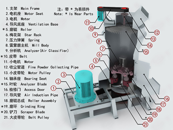 物料研磨后,風(fēng)機(jī)將風(fēng)吹入主機(jī)殼內(nèi),吹起粉末,經(jīng)置于研磨室上方的分析器進(jìn)行分選,細(xì)度過粗的物料又落入研磨室重磨,細(xì)度合乎規(guī)格的隨風(fēng)流進(jìn)入旋風(fēng)收集器,收集后經(jīng)出粉口排出,即為成品。風(fēng)流由大旋風(fēng)收集器上端的回風(fēng)管回入風(fēng)機(jī),風(fēng)路是循環(huán)的,并且在負(fù)壓狀態(tài)下流動,循環(huán)風(fēng)路的風(fēng)量增加部分經(jīng)風(fēng)機(jī)與主機(jī)中間的廢氣管道排出,進(jìn)入小旋風(fēng)收集器,進(jìn)行凈化處理。